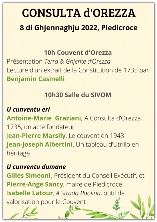 Quatre ans plus tard, c’est encore dans ce couvent que se réunit la consulte d’Orezza, du 6 au 8 janvier 1735. C’est cette assemblée qui élut Luigi Giafferi, Hyacinthe Paoli et André Ceccaldi comme Généraux de la Nation et qui prépara le texte de la première constitution corse, promulguée à Corti le 30 janvier suivant. Les représentants du peuple corse décidèrent également que le 8 décembre de chaque année, jour de l’Immaculée Conception, serait désormais la fête de la Nation, en l’honneur de la Vierge Marie, sous la protection de laquelle le Royaume de Corse fut placé. Depuis, l’hymne national et religieux de la Corse est le Dio vi Salvi Regina.